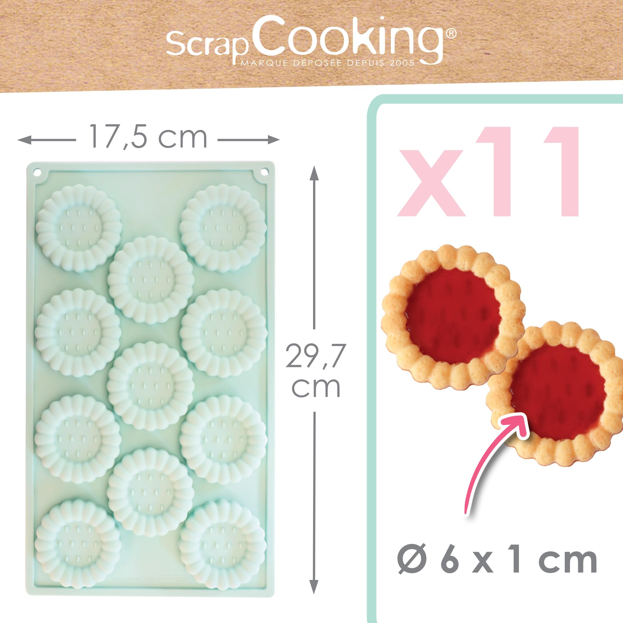 Détails: 👩🏻🍳 RÉALISEZ DES TARTELETTES MAISON – Un moule souple en silicone pour confectionner de jolies tartelettes maison. Idéal en cadeau ou pour lancer une activité pâtisserie qui régalera petits et grands à l’heure du goûter ! ✨ 11 FORMES TARTELETTES – Contient 11 cavités en forme des traditionnelles tartelettes de l’enfance ! Dimensions du moule : 29,7 x 17,5 x 1,1 cm. Dimensions d’une tartelette : 6 x 6 x 1 cm. Coloris du moule : vert d’eau. 👍 MOULE FLEXIBLE & ANTIADHÉRENT – Silicone souple 100% Platinum de qualité professionnelle et apte au contact alimentaire. Un démoulage rapide et facilité grâce au revêtement antiadhérent qui n’attache pas. Passe au congélateur, au micro-ondes, au four. Résiste à de fortes températures (de -20°C à + 230°C) pour vous garantir une cuisson réussie. Facile à nettoyer au lave-vaisselle. 🍓 AVEC RECETTE – Au dos de l’emballage, retrouvez la recette des tartelettes aux fraises. Pour réaliser la pâte pour +/- 15 biscuits, prévoyez 200 g de farine, 80 g de sucre glace, 1 cuillère à café d’arôme de vanille liquide, 1 œuf, 90g de beurre et 200 g de confiture de fraise. Envie d’autres parfums ? Abricot, framboises…faites parler votre créativité et créez vos tartelettes sucrées ou salées à votre goût ! 🇫🇷 MARQUE FRANÇAISE – ScrapCooking est une marque française qui conçoit depuis 2005 des produits ludiques et à la portée de tous pour réaliser et embellir ses pâtisseries et douceurs maison. L’ensemble de nos produits sont imaginés en France, dans nos ateliers à Fondettes (37).